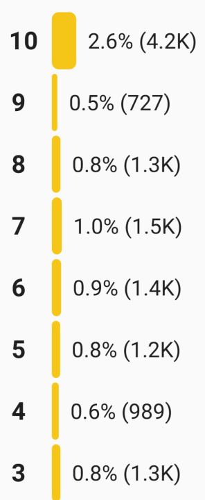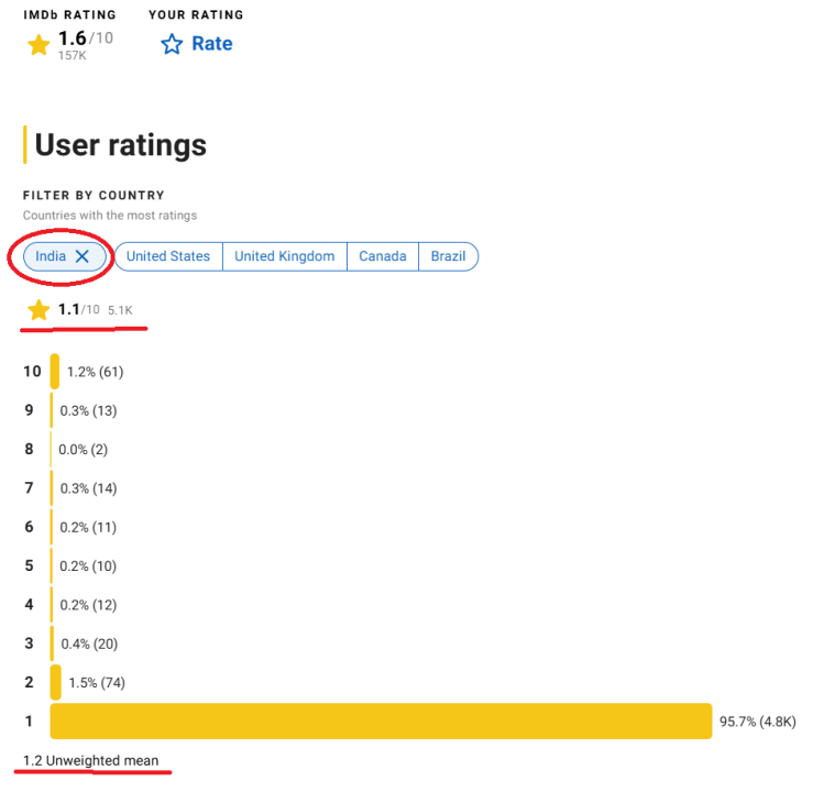 Sagaen om IMDB-scoren fortsetter. 💀 1. Scoren når nye "høyder". 1,6 (!!) @ 157k stemmer. 89% av stemmene er 1/10! 2. IMDB har lagt inn varsel om Unusual activity. 😂⬇️ Også interessant å se nærmere på India sine stemmer. Uvektet gjenomsnittlig brukerscore er 1,2, men pga. IMDB sitt vekting-system så vil de seriøse brukerene sine stemmer telle sterkere. Så når IMDB scoren blir 1,1 fremfor 1,2 eller høyere, tyder det på at det er de mest seriøse brukerene som gir den 1/10. Er ihvertfall slik jeg tolker det. Når slike tendenser eksisterer blir det kanskje ekstra vanskelig for IMDB å vurdere hvem som review-bomber, og hvem som genuint bare synes filmen fortjener 1/10.