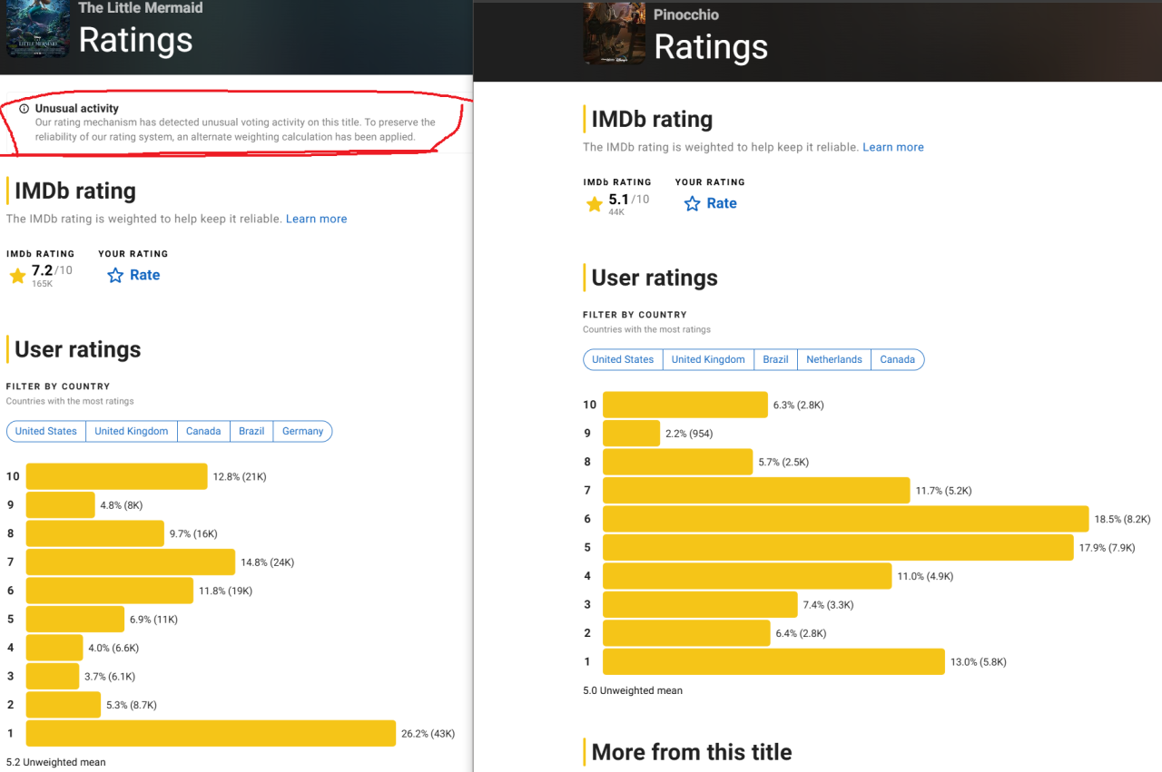 IMDB score på 1,9 @ 76K er interessant. 🍿 Noen vil nok klage på at de ikke kan ta IMDB scoren seriøst. Men om vi tar en titt på The Little Mermaid 2023, så var det vistnok noe av de samme tendensene der. At filmen fikk en unormal mengde 1/10 ratinger. IMDB gjorde derfor endringer, og valgte en unik vekting. Dette er noe de selv opplyser om når man klikker inn på selve scoren for mer detaljer. Dersom The Little Mermaid (2023) skulle hatt en nøytral (uvektet score) som kun er basert på folk sine stemmer så hadde den vært på 5,2, men den er 7,2 @165k. En vanlig IMDB score har alltid litt "vekting". Det vil si at de vektlegger "seriøse brukere" hakket mer enn "useriøse brukere". Men denne type vektlegging endrer vanligvis ikke IMDB scoren mer enn 0-0,2 bort fra den uvektede scoren såvidt jeg vet. Jeg har lest litt på Reddit rundt spesielvektingen IMDB gjorde på the Little Mermaid. Jeg sitter med inntrykk av at folk som har gjort litt analyser har avdekket at IMDB i høy grad bare fjernet en masse med 1/10 vurderinger, men lot 10/10 vurderingene være. ( ⬆️ Bilde kilde. Kan hende filmen da var på ca 17k stemmer. Så spesialvektingen kom nok ganske tidlig på den filmen.) En slik løsning kan bli problematisk. F.eks, når en film havner i en kulturkrig og potensielt får "unaturlig lav score", så vil også folk fra den motsatte siden lettere vurdere den høyere for å utligne. (Legg f.eks merke til hvor mange som gir filmen 10/10 vs 7/10 i bilde ovenfor vs i bilde nedenfor til venstre som er fra i dag.) Så når IMDB korrigerer ene siden (1/10), men ikke andre (10/10), så får man en vurdering som kan være enda mer misvisende, bare i motsatt retning. Det er nok ikke en lett jobb å korrigere godt og nøytralt når det også er politiske stemmer inne i bildet, spesielt ikke på en dårlig film. Men det er uansett interessant at IMDB sålangt ikke har lagt inn en unik spesialvekting på Snow White slik som de gjorde på The Little Mermaid. Bare for å sette ting i perspektiv så kan vi se hvordan spesialvektingen på The Little Mermaid (2023) slår ut vs Pinocchio (2022) som har ordinær vekting: Pinocchio- 5.0 unweightet mean - 5.1 IMDB score - Differanse mellom bruker stemmer og IMDb score = 0,1 The Little Mermaid - 5.2 unweightet mean - 7.2 IMDB score - Differanse mellom bruker stemmer og IMDb score = 2