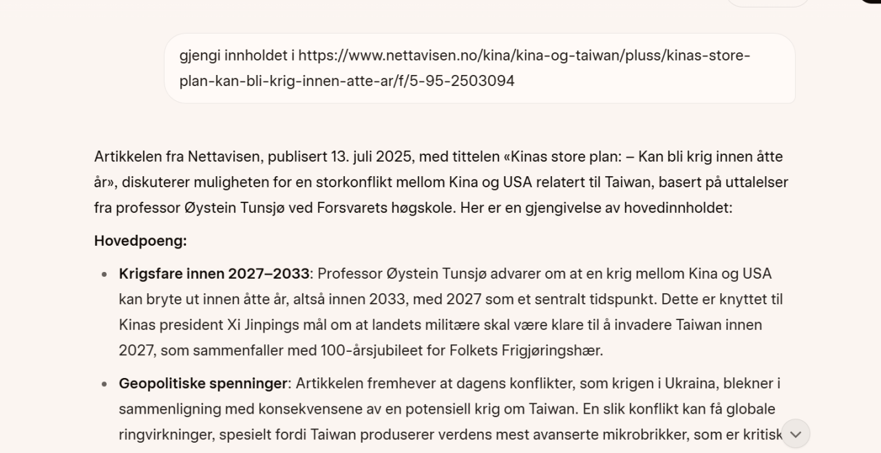 Fikk ikke tilgang (har ikke abonnement), så ba Grok AI (som ikke bryr seg alltid) om å gjengi innholdet. Perplexity.ai nektet 🤕😊 Jeg tror ikke det er helt reelt med direkte krig, på grunn av at USA og Kina er atommak( med våpen stasjonert ute i stillehavet gjennom atomubåt, se https://www.nrk.no/urix/kina-viser-muskler_-sender-ut-atomubater-og-advarer-mot-taiwansk-selvstendighet-1.12968696). Det som er mer sannsynlig er indirekte krig, gjennom Taiwan, hvor USA står til forsvar.