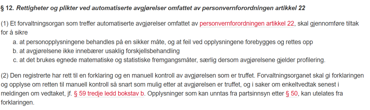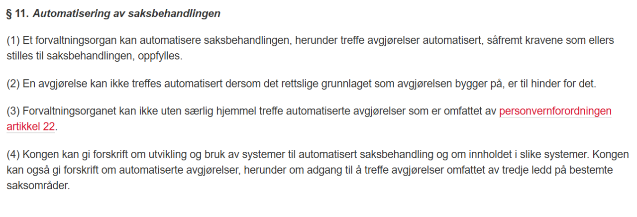 Det er en ny forvaltningslov (Lov om saksbehandlingen i offentlig forvaltning (forvaltningsloven) - Lovdata) på vei, fra den tid Kongen mener er riktig, som har veldig stort fokus på automatisering av oppgaver (automatisering av avvising og heleggelser) Følgende automatiserings paragrafer er like rundt hjørnet: Tenker det kan være hensiktsmessig å bruke det som et vern, som gjør den ubehagelige jobben med å henlegge og avvise; hvis en er uenig, kan en bruke §12 andre ledd til å kreve manuell kontroll. Tenker da på NAV (der folk blir drapstruet) , risiko saksbehandling i kommunen og tilsvarende. Hvis det går igjennom, så kan en se nøyere på saken - slik at det ikke bare er en AI som har avgjort saken. Hvilke områder mener dere en burde ta i bruk slik automatisering, i første om gang`?