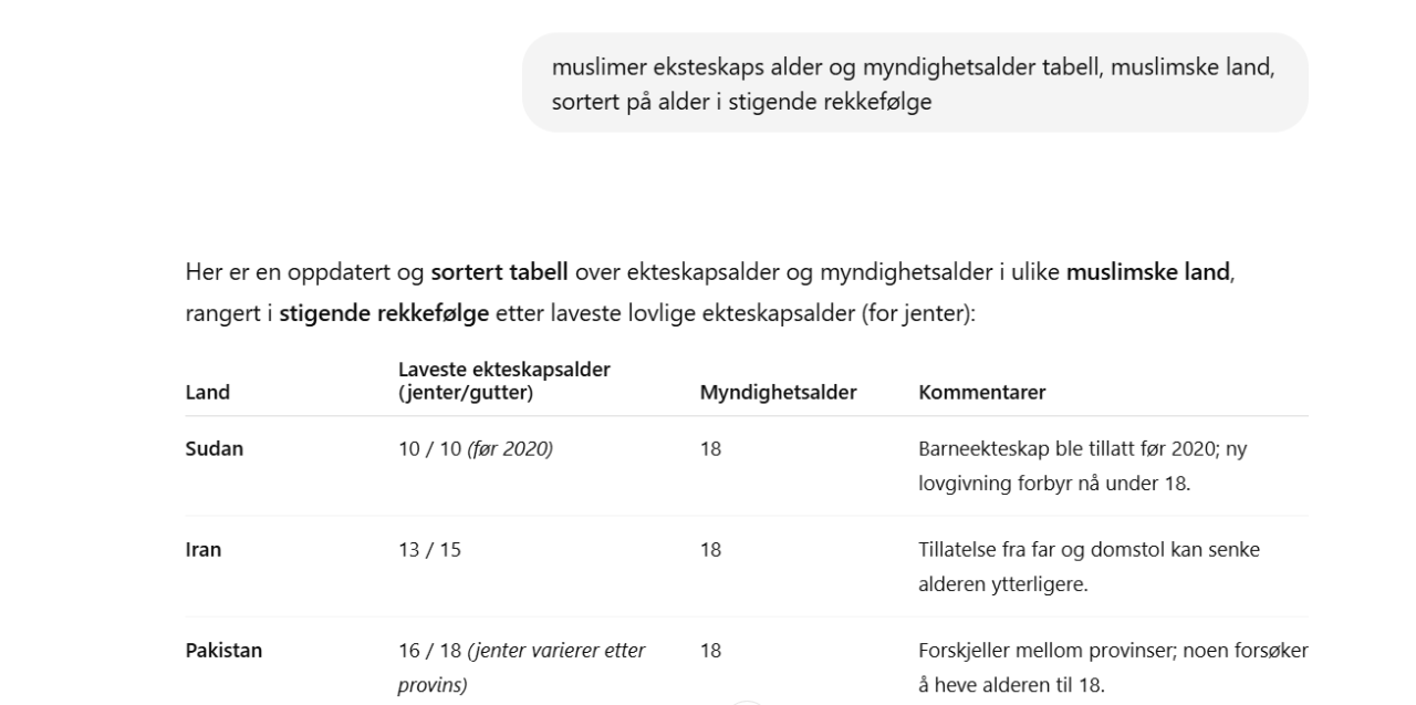 Tror du sammenblander muslimer med Iran og deres lovverk (tok å spurte chatGPT om det, se bilde nedenfor), dette med ekteskaps alder er ikke en muslims greie - da hadde for eksempel ikke det vært kun 2 land som sitter igjen med tørt og dårlig lovverk. -