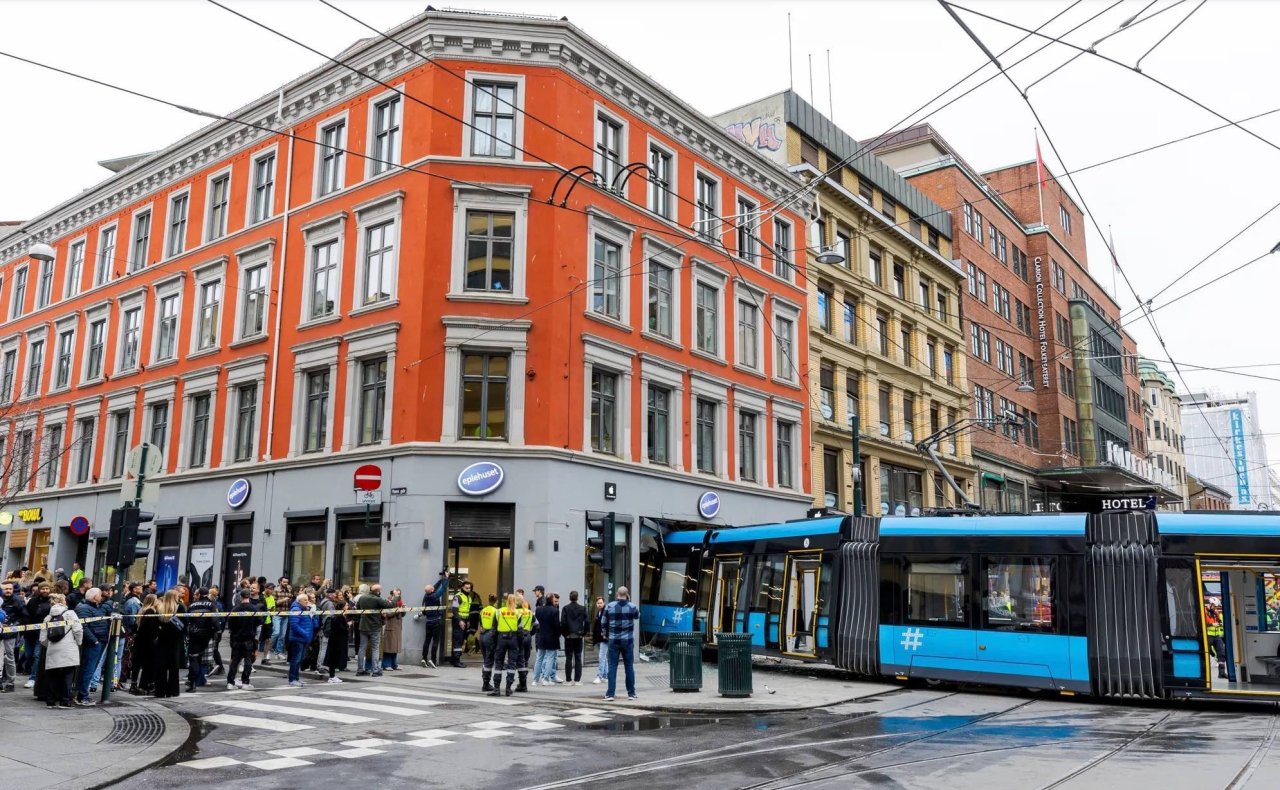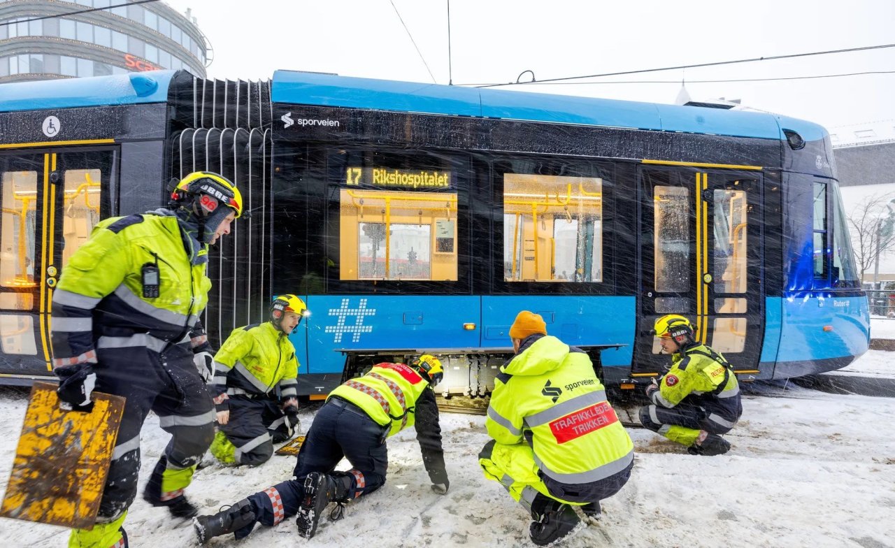 23/1-25: En av de nye trikkene, 50 tonn tung og med en toppfart på 70 km/t, sporte av på Jernbanetorget. Bare flaks at ingen fotgjengere ble skadet. Foto Arash A. Nejad. Har Sporveien vært for mye opptatt av fart, sett bort fra at det er farten som dreper og kjøpt feil type trikk?