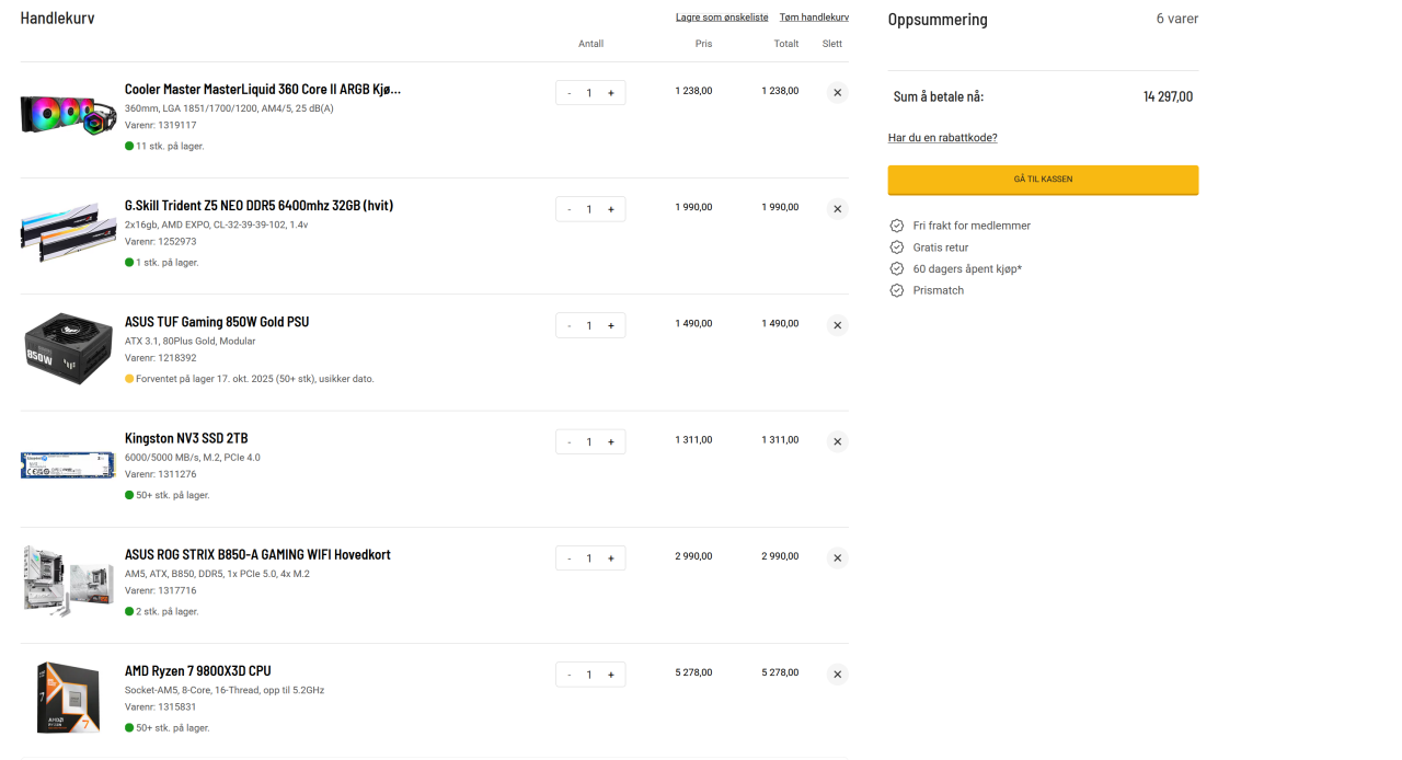 Ser at du får X870 kort i samme prisklasse, kan være verdt å gå for et slikt isteden for B850 https://www.komplett.no/product/1313926/datautstyr/pc-komponenter/hovedkort/amd-socket/asrock-x870-steel-legend-wifi-hovedkort