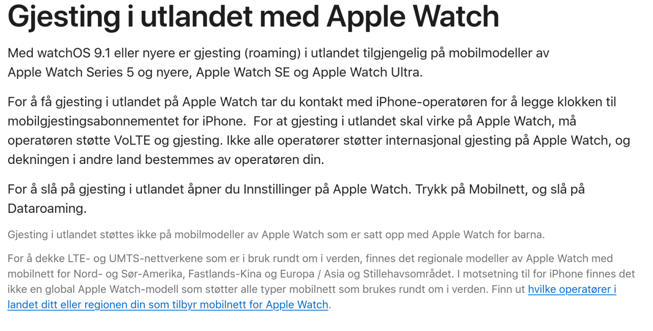 Se under Gjesting i utlandet med Apple Watch her (https://support.apple.com/no-no/119601), under «For å slå på gjesting i utlandet åpner du Innstillinger på Apple Watch. Trykk på Mobilnett, og slå på Dataroaming.» står teksten i lysegrått på hvit bakgrunn: