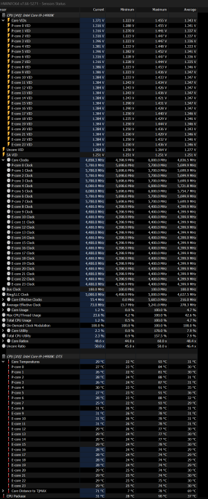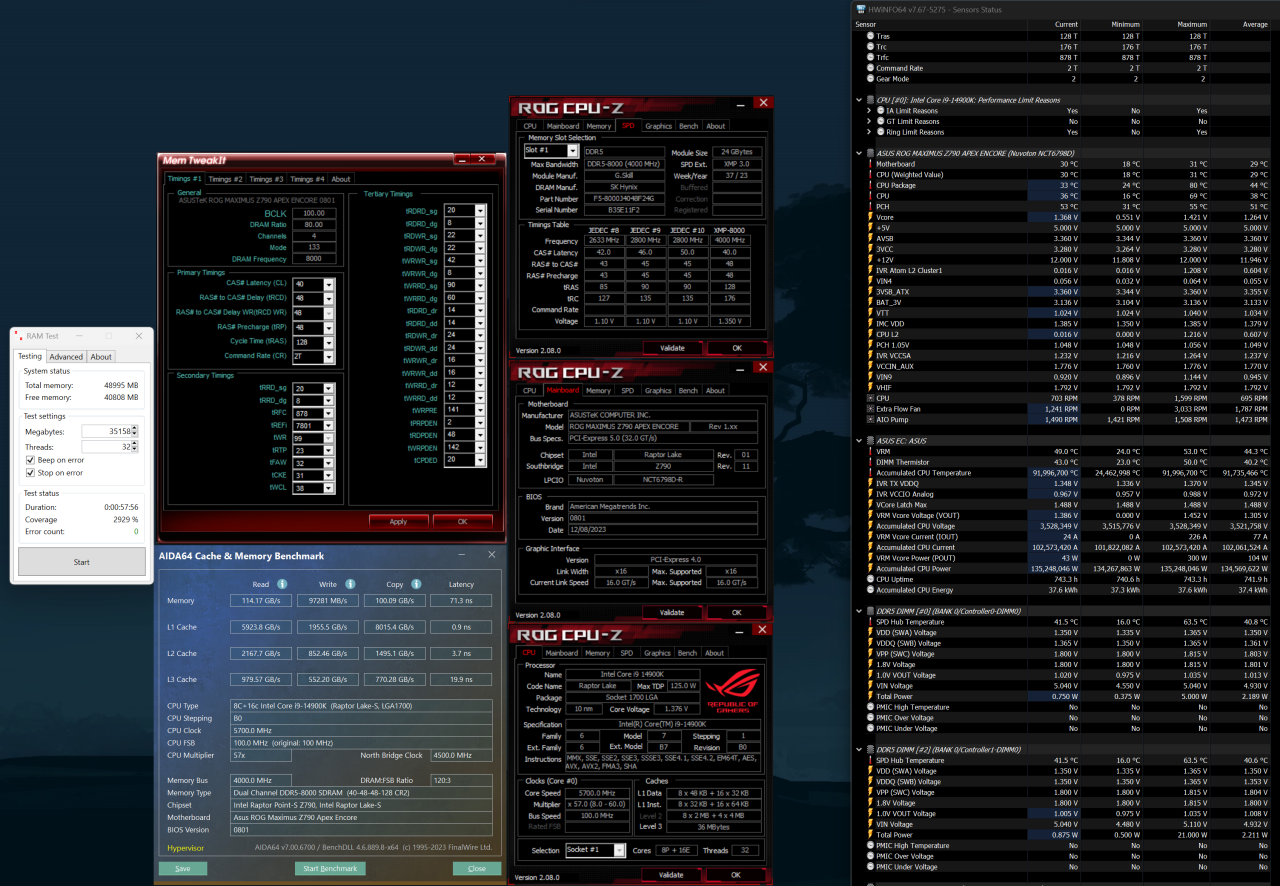 Alt er stabilt slik det kjører nå. Hovedkortet er et apex encore og cpuen en 14900k, no-limits i bios på multi-core enhancement (253w++). Trekker vel fort 350w+ om jeg drar i gang OCCT eller cinebench.
