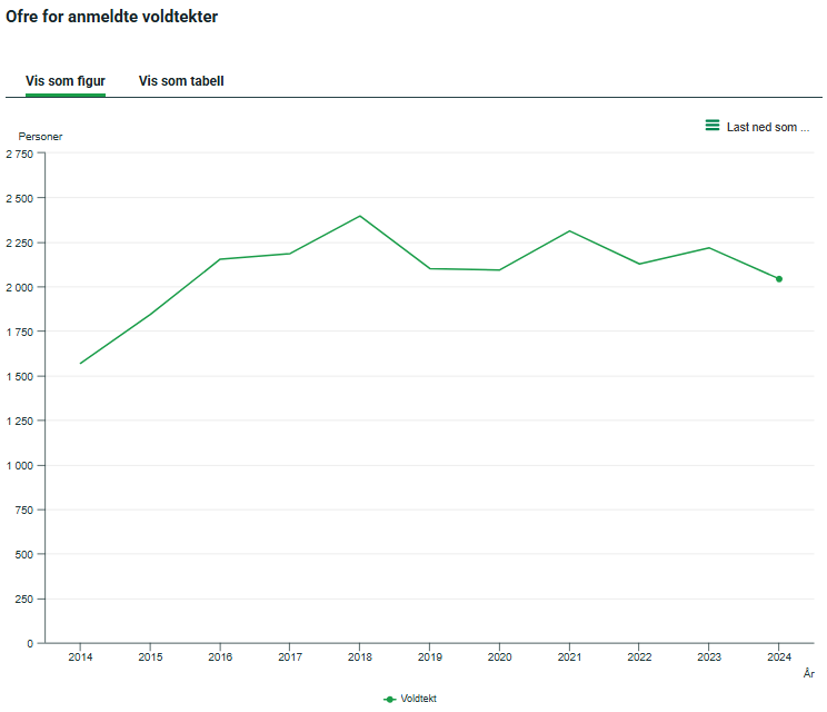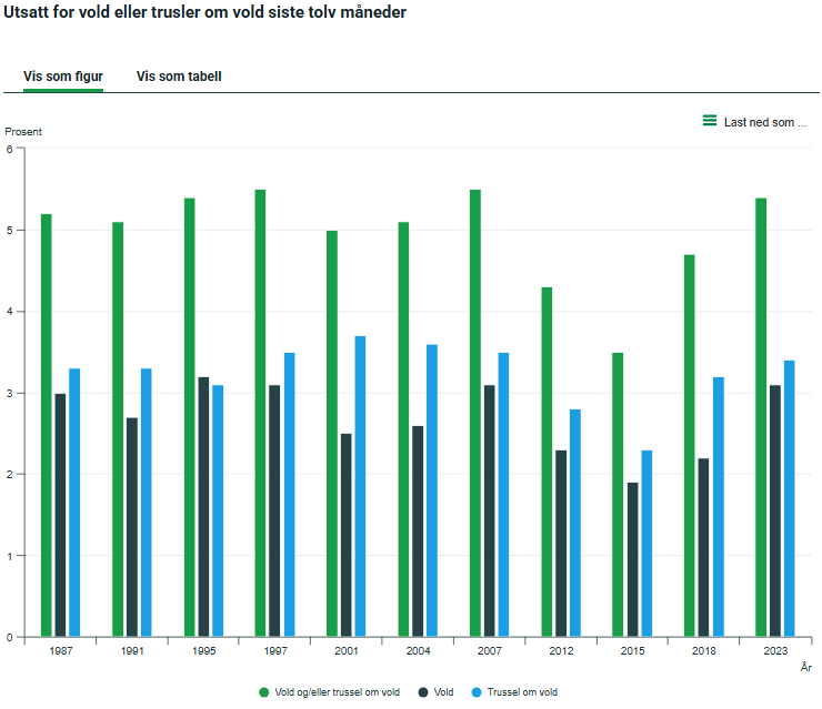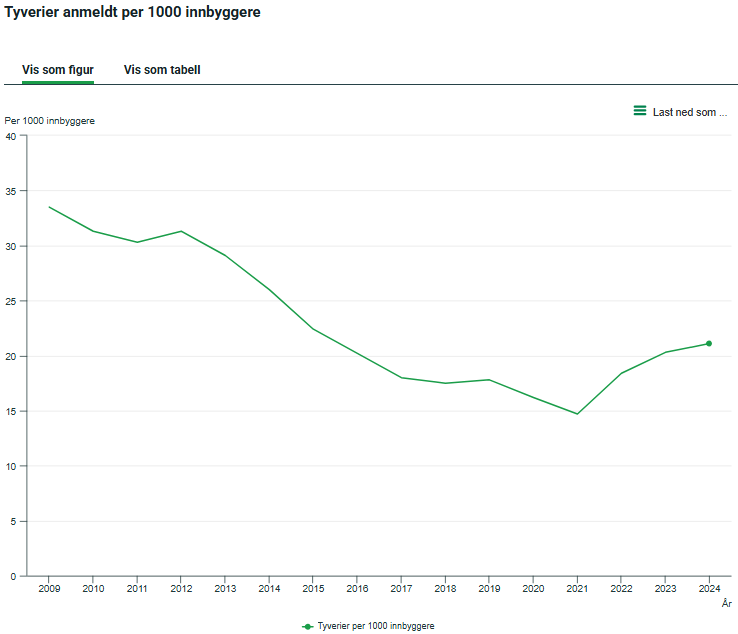 Denne grafen slutter der grafen for Anmeldte tyverier som jeg viste ovenfor begynner (2009). "Min" graf fortsetter å falle helt til 2021, og da er den på "din" grafs 1970-nivå. Er ikke det litt hyggelig, da? (Jeg fylte 1 år i 1970...) Den der greier jeg knapt å lese. Dog tydelig oppgang siden 1950 på alle grafer. Men hvis Norge er den nederste, er den vel også flatest, og det stemmer godt med voldsstatistikken 1987-2023 som jeg viste ovenfor. Den inkluderer også vold som ikke er anmeldt/etterforsket, fordi den baserer seg på spørreundersøkelser.