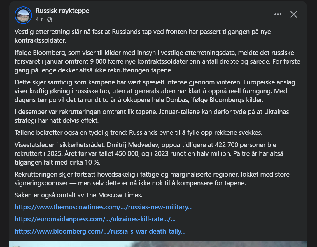 https://www.themoscowtimes.com/2026/01/16/russias-new-military-recruits-dipped-in-2025-figures-show-a91703 https://euromaidanpress.com/2026/02/06/ukraines-kill-rate-just-overtook-russias-troop-replacement-syrskyi-says/ https://www.bloomberg.com/news/articles/2026-01-30/russia-s-war-death-tally-spurs-european-scrutiny-on-recruitment- 88 202 svar