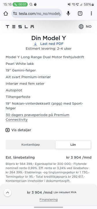 Ok, nyttig info. Men hvordan stiller der seg med 2-4u leveringstid? Dette er konfigurasjonen jeg isåfall skal ha. Ringte tesla i stad og de sa at rentekampanjen var over nå på fredag, så hørtes ut som man måtte være litt kjapp i tilfelle..