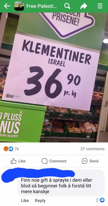 Interessant og opplysende, men samtidig bør det ikke være veldig sjokkerende at MIFF bare er et propaganda apparat for Israel, på samme måte som Palestinakomiteen er det for Palestina. Her er det mange grupperinger på begge sider med svin på skogen for å si det slik. "Free Palestine - Save Gaza"-gruppen for eksempel. Den tiden jeg var der inne så jeg flere eksempler på oppfordring til drap på jøder, utsagn som "alle jøder bør utslettes" etc. Disse utsagnene fikk både mange upvotes, mange kommentarer av typen "Enig" etc. og ble stående helt uimotsagt. Det var også andre innlegg om boikott av butikker etc. hvor folk i kommentarene oppfordret til hærverk og forgiftning, som for eksempel dette: Min erfaring er at slike fora/grupper/interresseorganisasjoner gjerne blir mer ekstreme over tid og disse ekkokamrene ender bare opp med å bli en yngleplass for de mer ytterliggående elementene. Ekstremister er generelt sett et onde, uansett hvilken "side" man er på (eller om man befinner seg mer i midten for den saks skyld). Det er også gjerne i slike kretser at all form for kritikk av Israel eller Palestina blir stemplet som antisemittisme eller muslimhat, noe som ikke er noe annet enn dårlige forsøk på å kneble meningsmotstandere.