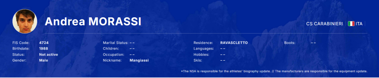 Et (faktisk) Arne Scheie sitat jeg finner meg selv litt humdrende over er fra et verdenscuprenn i hopp for mange år siden. "Og vi har kommet til italieneren Andrea Morassi, et pikenavn og litt fleipete kan vi si at han er oppkalt etter mora si". Link: