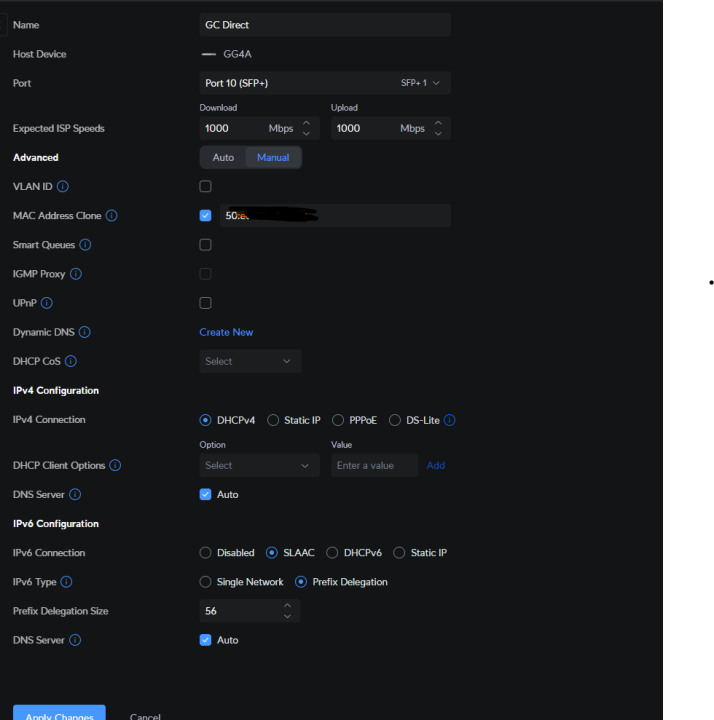 Heia Kom du noengang i mål her? jeg har samme nå jeg får link på egen router med egen bidi sfp, jeg får ikke IP selv når jeg kloner mac, min CPE er idag i bridge fra GC. -