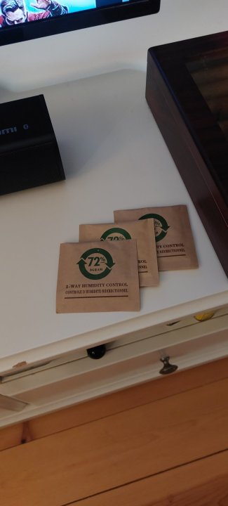 Jeg har disse fuktpose greiene, har kjøpt ganske mange av dem. På temu. Disse skal gjøre det fuktig og kunne holde en humidor med plass til 20 - 25 sigarer fuktig nok relativt lenge. 55 - 70% fuktig. Men jeg føler ikke at det funker i det hele tatt. De funker kamkje med én pose i en boks med plass til tre sigarer, men har null virkning i en humidor. Skal sies at disse på bildene er kjøpt på temu, mulig det kan ha noe å si. Er jo svindyre i Norge.