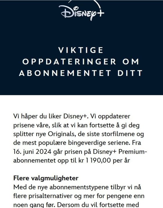 1. Disney "tar en HBO" og øker prisen med 34%. Om man kutter ut 4K og HDR beholder man gammel pris. Hvordan å øke prisen uten å tilby noe nytt er å gi "mer for pengene" klarer jeg ikke se.