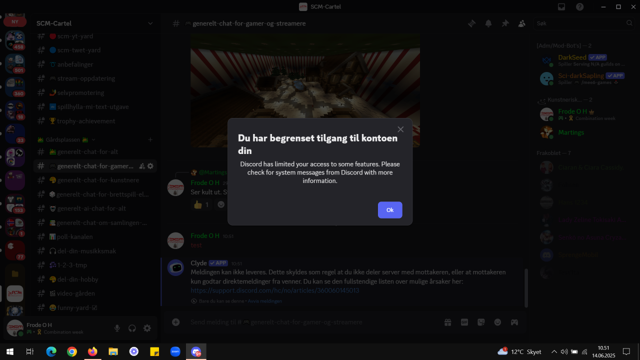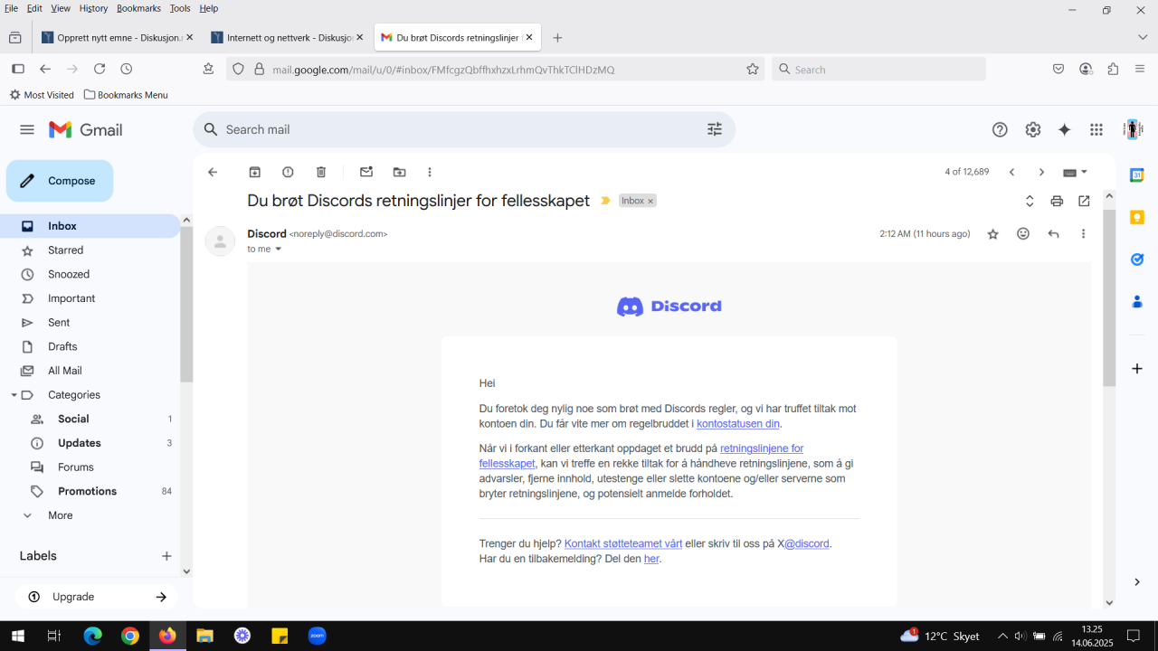 Jeg fikk en rar epost igår, om at jeg har brøtte en regel på Discord. Jeg skjønner ikke hvordan det kan ha seg. Jeg har ikke gjort noe gærnt. 😧 Jeg har prøvd og kontakte dem om hva jeg har brøtte for noe. Og at dette er en feil. De gir ikke konkret svar på det. 😔 Trenger hjelp. 😢 Nå får jeg ikke lov og poste på min hoved bruker heller. (Se andre bildet.)