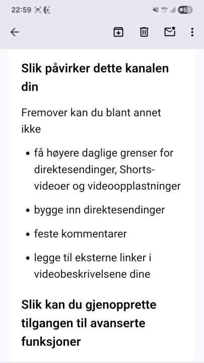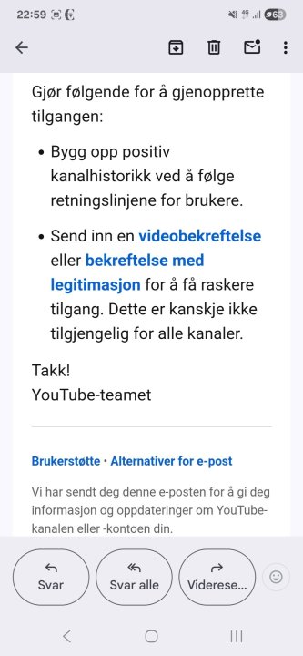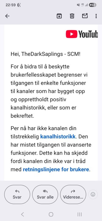 Hva er det med YouTube nå for tiden?TheDarkSycamore - SCM publiserte et emne i Internett og nettverk Hvorfor gjør YouTube dette? Kan noen forklare? Er det lov av dem og gjøre dette? 😳😳 Nå er jeg spent om om jeg får streamet i det hele tatt i morgen på YT. 🥺🥺 Fikk dette fra dem i dag på e-post.