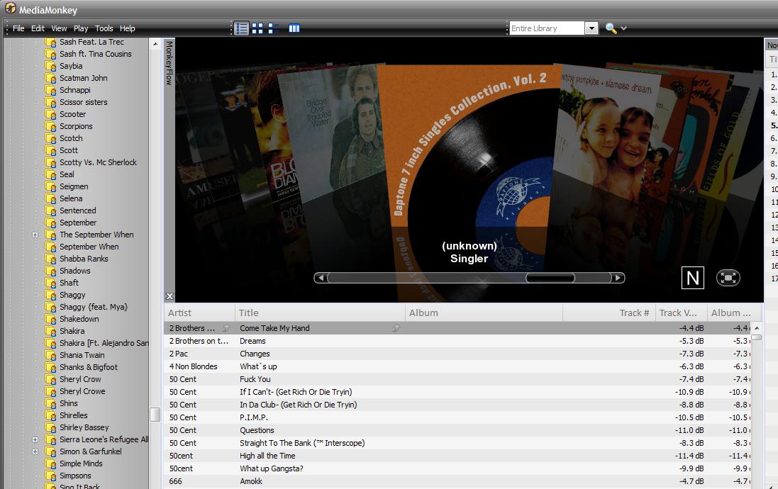 Marve_Almar Skrevet 14. desember 2008 Skrevet 14. desember 2008 1. Er det mulig å slå av fadinga på slutten av sangene. Er utrolig irriterende.2. Er det mulig å laste ned ein addon som legger til "coverflow" funksjon ? Takker for alle svar Klikk deg inn på http://www.mediamonkey.com/forum/viewtopic...e6fb935bdd48e07. I det første innlegget i MonkeyFlow tråden finner du en lenke til "embedded version" (http://www.mediafire.com/?ju1n3mn0nuw). Installasjonen er enkel - kun to filer du plasserer i mappen "..\MediaMonkey\Scripts\Auto". Fungerer utmerket! Tips: Dersom du har mange single låter som ikke er tagget til et spesielt album (anbefaler deg å fjerne Album info på "single" låter), er det en ide å f.eks. skrive "Singler" i Album Artist taggen. Da samles alle singlene under "et cover" (og da også under et album i andre visninger). Alternativet er at det genereres et cover / album per låt - noe som evt. gjør MonkeyFlow / CoverFlow ubrukelig. Se vedlegg - skjermbilde fra MediaMonkey m/MonkeyFlow. Legg merke til trikset for å samle alle single låter under et cover.