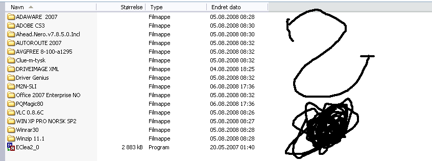 eminem1 Skrevet 1. oktober 2008 Skrevet 1. oktober 2008 (endret) Hei Tenkte det var på tide å rydde opp i pcen og fjerne div. program som jeg ikke bruker Har laget en sirkel ang de programmene jeg er usikker på at jeg kan laste ut.. Se bilde 1 Ang. bilde 2 Har godt inn på D disken min og der TROR jeg det er mange ubruklige mapper MappeNavn:$AVG8.VAULT$ plassering på bilde: Øverst Innhold: Denne mappen inneholder kun FIL filer.. Filene heter "V_00000379.fil" og "V_00000380.fil" osv.. Kan jeg slette denne mappen? MappenNavn:ANDREAS-C plassering på bilde: Nest øverst Innhold: En mappe som heter "NVIDIA", "Program Files (x86)", "Program Files" , "Users" og "Windows".. Det jeg tror er at dette er de gamle filene påpcen min før jeg oppdaterte den med alt som var inni den.. Kan jeg slette disse? MappeNavn:IDE Innhold: Er en mappe der som heter "Commen7" og trykker man på den så kommer det mange .dll filer.. mappenavn: INSTALL Innhold: SE egent bilde...! Blei ganske rotete, men trenger hjelp, send meg en PM hvis du vil hjelpe meg men at dette blei litt rotete.. Tar flere etter hvert BTW, grunnen til at jeg tror jeg kan slette disse filene/mappene er pågrunn av at jeg har brukt 120 GB på denne disken og jeg har ikke så mange spill på den.. fdfgg.bmp Bilde_2.bmp Mappen_INSTALL.bmp Endret 1. oktober 2008 av eminem1