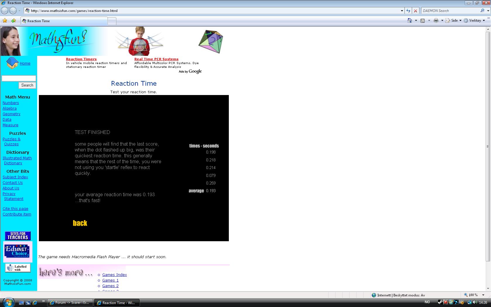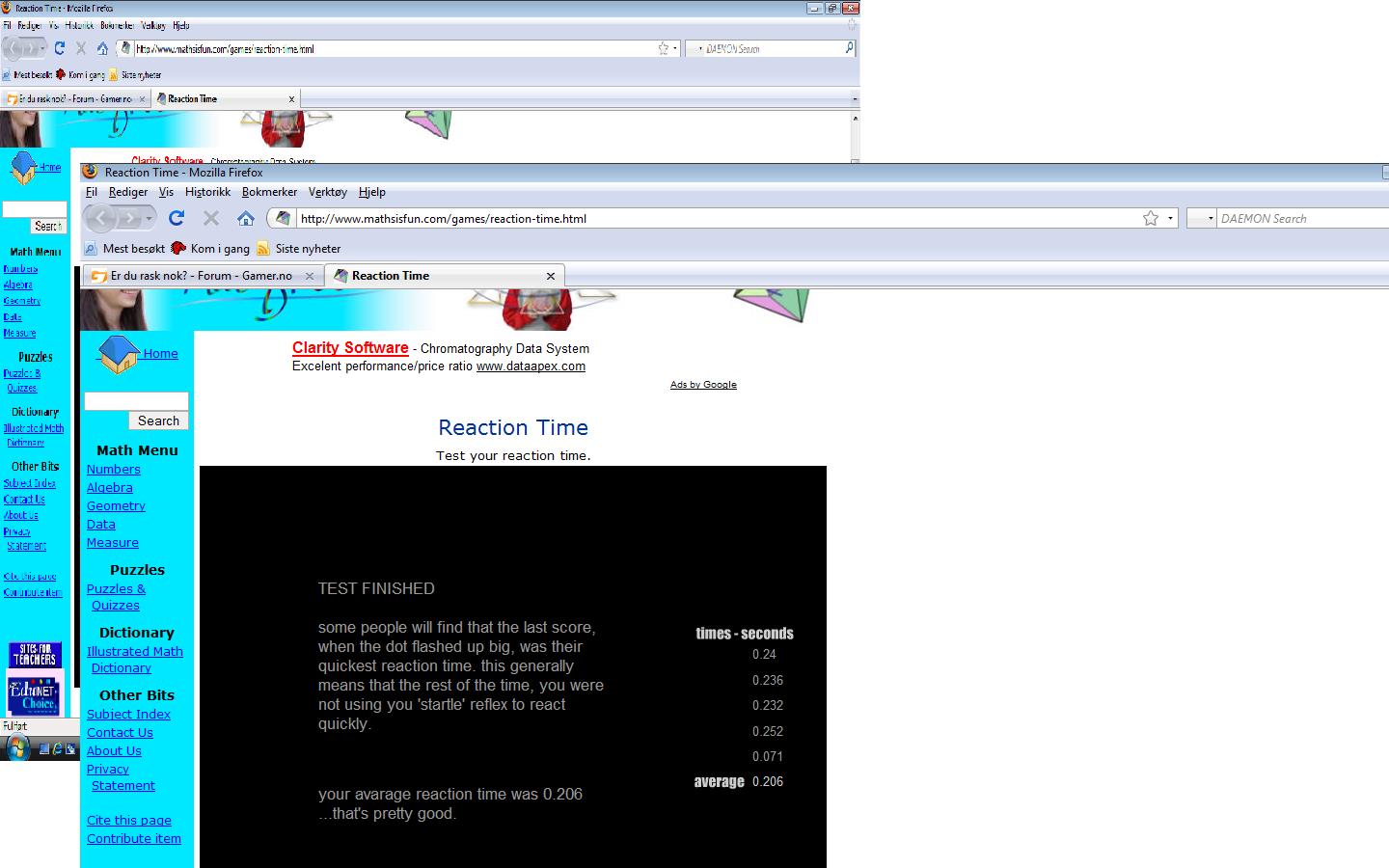 JAPCU Skrevet 19. oktober 2008 Skrevet 19. oktober 2008 (endret) Skjønte ikke helt det de mente med at den siste reagerer man raskere på.Noen som kan forklare det på norsk? De første 4 klikkene er bare oppvarming. Tar litt tid før refleksene skjerpes. Klarte 0.26 på første forsøk. Endret 19. oktober 2008 av JAPCU