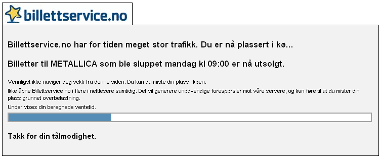 Isbilen Skrevet 20. oktober 2008 Skrevet 20. oktober 2008 Billettservice' webtjenester er ikke (forståelig nok) dimensjonert for de verste periodene. Skal man være sikret billetter til slike ting er det bare en ting som gjelder: å stille seg i kø ved et utsalgssted. De maskinene vil alltid ha prioritet foran nettsalget, og stopper ikke opp så lenge ikke systemet kneler.
