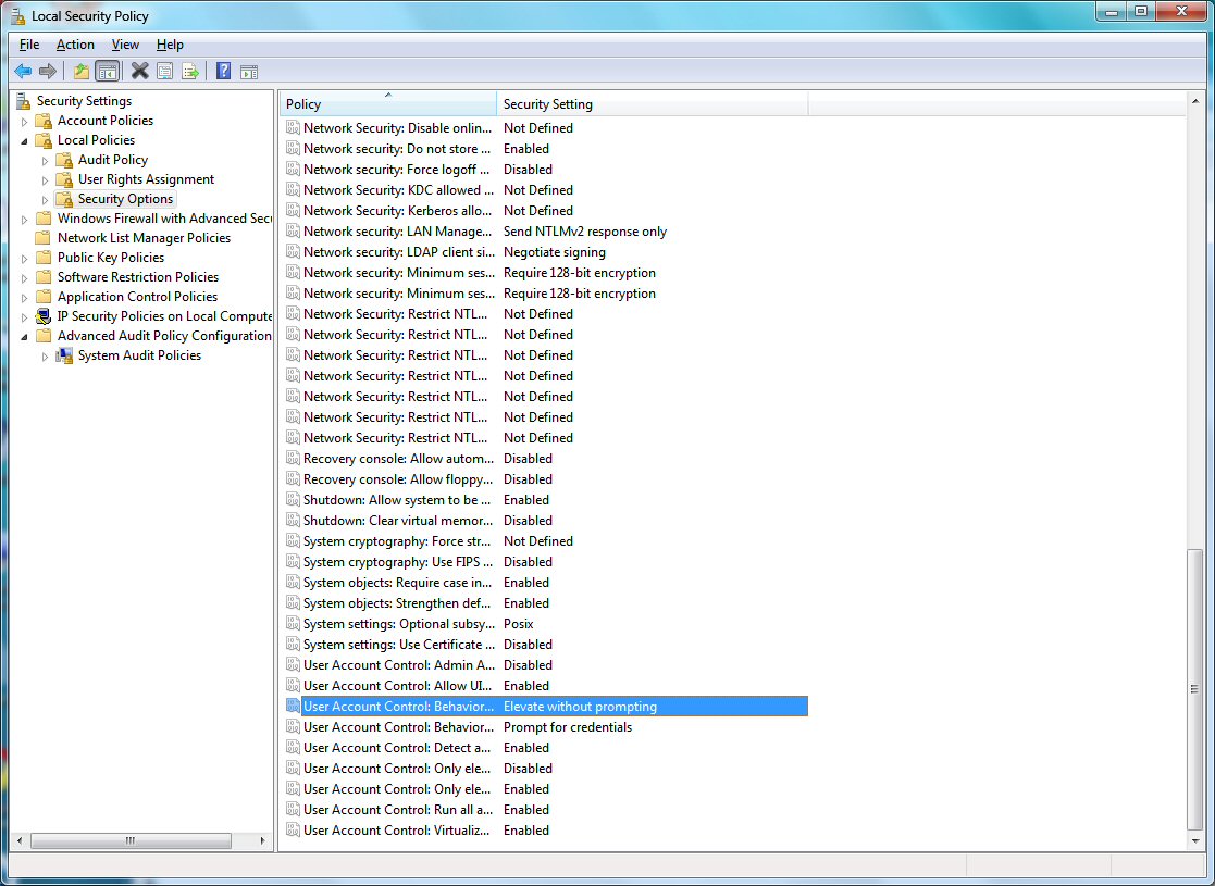 Istedet for å slå av UAC helt er det bedre å automatisk elevere uten prompting via group policy.