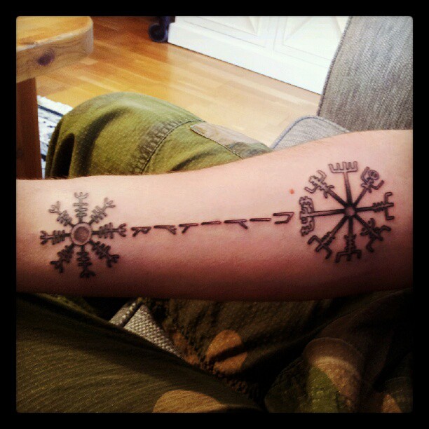 Thor - God Of Thunder Skrevet 12. juni 2012 Skrevet 12. juni 2012 (endret) Du er ikke sikker på designet, men skal tatovere det allerede i morgen? Planen er i fyrsteomgang å få eit prisoverslag. Om han er tid, skal eg ikkje sjå bort frå at det blei ei tatovering. I den forbindelse, lurar eg på om det er nokon som er veldig sikre på det med runer og elder futhark. Skal blant anna tatovere "vikingrr", men det skal stå med runeskrift. Har funne to forskjellige måtar å skrive det på, og forskjellen ligg i g'en. Om ein ser her: http://en.wikipedia....i/Elder_Futhark Så ser man at det går an å bruke vanleg "n" og vanleg "g", eller det går an å bruke "*ingwaz" Kva er det som blir mest riktig? Om du skal bruke stavemåten "vikingr" som er norrøn ville jeg valgt å bruke runene fra den yngre futhark. Den eldre futhark bruktes bare på urnordisk noe som ville ført til at du ville endt opp med ei tatovering som ikke ville ha samsvar mellom bruk av språk og futhark. Blir det samme som om man skulle skrevet norsk med russiske bokstaver. Jeg legger med et bilde av slik jeg ville skrevet det med noen av de yngre runene. Har hatt runologi som fag på NTNU det siste halvåret nå + A i norrønt, så tror jeg skal ha det på stell Begge de måtene jeg på bildet er fullt mulige, men skrifttegnene i den nederste er noe yngre enn den øverste. I tillegg vil jeg bare peke på at det ikke finnes noen egen rune for "v" og de brukte "u" for den også. De hadde heller ikke opprinnelig noe eget tegn for "g", men "punkterte" runer dukket etterhvert opp, og det er dette som har ført til at k-en har blitt til en "g" i den andre innskrifta =) Tusen hjertlig! Har eldre futhark på ryggen, men etter å ha sett forslaget ditt, så blir det den! Endret 12. juni 2012 av ´Vikingen`