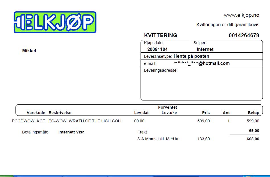 Proxor Skrevet 11. november 2008 Skrevet 11. november 2008 (endret) her er mail eg fekk fra elkjøp idag vertfall. Meg: Hei, har bestillt 2 eksemplar wow lich king. collectors edition og normal. bestillte og betalte for 1 mndes tid sia. rekner med og ha det til release datoen? sia eg ser dere nå reklamerer med stor banner på siden, bestill idag og få spillet til lansering 13.11.2008 stemmer dette? svar fra elkjøp: Hei og takk for din henvendelse Har ingen holdepunkter for å si at det ikke kommer til realease dato nei. Så det har du nok til den gitte dato. Endret 11. november 2008 av Kurt-Inge