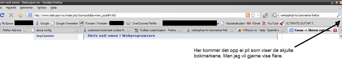 JayCamino Skrevet 10. november 2008 Skrevet 10. november 2008 Hei, Når jeg har lagt til en del bokmerker, så blir de skjult, fordi det ikke er plass til flere synlige. Er det noen måte jeg kan få alle synlige? Forstørre verktøylinja eller noe?