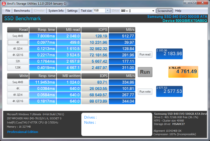 johome Skrevet 29. september 2014 Skrevet 29. september 2014 Hei. Da kjørte jeg Anvil Pro (må legge til at jeg hadde en del andre programmer oppe å gikk samtidig) Hva sier dette dere? Sekvensiell skriving er nok ikke helt slik det burde ha vært. Burde ha vært på bortimot 500 MB/s : Tror ikke du heller har installert Intel RST