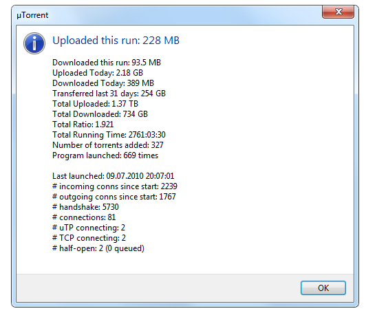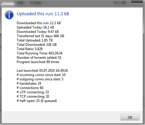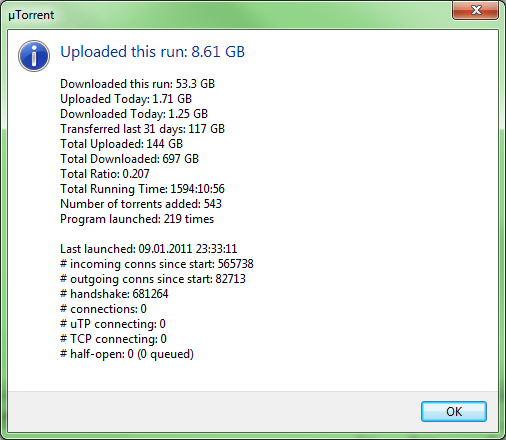 morgan_kane Skrevet 5. juli 2010 Skrevet 5. juli 2010 (endret) [Window Title] µTorrent [Main Instruction] Uploaded this run: 2.95 GB [Content] Downloaded this run: 272 MB Uploaded Today: 2.90 GB Downloaded Today: 375 MB Transferred last 31 days: 92.7 GB Total Uploaded: 69.8 GB Total Downloaded: 15.6 GB Total Ratio: 4.468 Total Running Time: 31:22:22 Number of torrents added: 136 Program launched: 22 times Det skumle e at eg ligg på konstant 1MB/s opp :S Har formatert PCen min for noen dager siden og holder på å bygge opp litt ratio igjen Endret 5. juli 2010 av morgan_kane