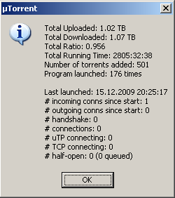 Tunky Skrevet 25. juni 2009 Skrevet 25. juni 2009 [Window Title] µTorrent [Main Instruction] Total Uploaded: 129 GB [Content] Total Downloaded: 271 GB Total Ratio: 0.476 Total Running Time: 1455:39:08 Number of torrents added: 184 Program launched: 205 times Last launched: 25.06.2009 23:26:22 # incoming conns since start: 3 # outgoing conns since start: 0 # handshake: 7 # connections: 8 # half-open: 1 (7 connecting) Jeg bør seede mer..