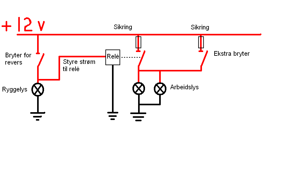 Crazeeayeskillah Skrevet 20. desember 2008 Skrevet 20. desember 2008 Hei. Skal montere 2 stk. arbeidslys på takbjelke på ein varebil. Vil at lysa skal koblast mot ryggelys slik at dei lyser når den står i revers, men eg vil ha ein eigen brytar på lysa slik at dei kan skruast av/på når bilen står parkert uten å måtte stå i revers. Er det nokon som har idear til korleis eg skal kople lysa, eventuelt nokon som kunne laga eit koplingsskjema?