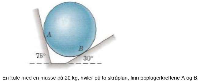 G Skrevet 15. september 2009 Skrevet 15. september 2009 (endret) Uten å være skråsikker med mine 2FY og 3FY kunnskaper så tror jeg følgende trekant er sammenliknbar med eksempelet (oppgaven) din: http://en.wikipedia.org/wiki/File:Freebodydiagram3_pn.svg Vi omgjør bittelitt på klossens egenskaper ved å tenke oss at klossen nå hviler på ett punkt istedetfor at det hviler på en flate. Kraften er lik den pilen du ser som peker loddrett ut av skråplanet. Det tror jeg må bli kraften i det punktet til kulen som tangerer med kraften COS vinkelen teta hvor vinkelen er 75 grader. Den andre kraften må du tenke deg at er lik friksjonen på klossen. Den vinkelen står jo 90 grader på den førstnevnte til klossen og de to kreftene lager til sammen Gravitasjonskraften (G). Så den andre kraften vi her snakker om må bli den som peker i motsatt retning av friksjonskraften (men de 2 er jo likevel like, så altså er den lik friksjonskraften). Nå snakker vi om kraften SIN vinkelen teta hvor vinkelen er 30 grader. Derfor tror jeg at svaret blir: Opplagerkraften til A = masse * g * cos 75 grader = 20 * 9,81 * desimaltall av (cos 75 grader) Opplagerkraften til B = masse * g * sin 30 grader = 20 * 9,81 * desimaltall av (sin 30 grader) Håper jeg ikke har blandet de 2 vinklene i regnestykket mitt (det er jo menneskelig å bomme litt på ting) Men de 2 vektorkreftene skal jo om du regner på det, gi Gravitasjonskraften, og om de ikke gjør det så er regnestykket mitt feil. Endret 15. september 2009 av G
