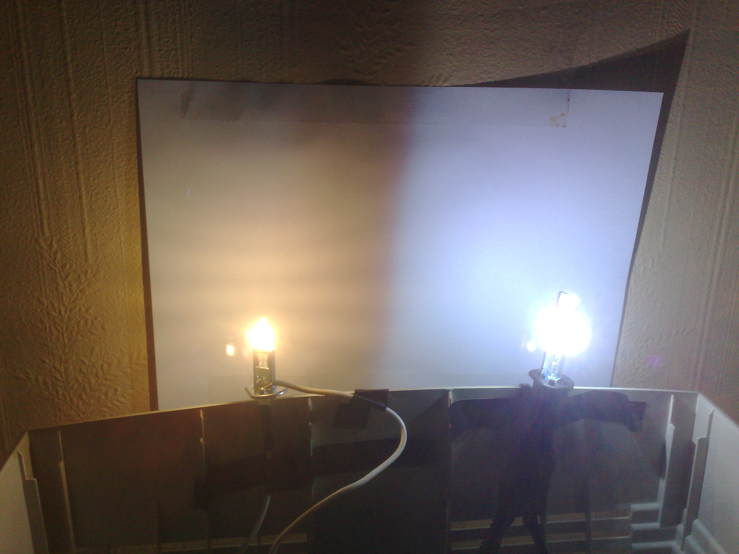 gxi Skrevet 18. januar 2009 Skrevet 18. januar 2009 (endret) Men jeg vil gjøre alt jeg kan for at det skal bli mest trafikksikkert som mulig. Om noen veit om hvordan jeg kan mekke automatisk høyderegulering så er de faktisk godkjent for bruk. (Har lyktespylere) Trafikksikkert blir det aldri, og lovlig blir det aldri heller. Du kan justere så mye du vil, men lyset vil aldri bli mer trafikksikkert enten for deg elelr for noen andre. Faktisk ser jeg gang på gang de som kjører med slike kits installsert med lysene rettet rett ned i veien "fordi det ikke skal blende". Resultatet er at man kan likegodt bare bruke tåkelys. Her er forskjellen på en HID-pære og en halogenpære. Det sier seg kanskje selv at lysbildet som lykten produserer blir aldri i nærheten av likt: Halogen H1: HID "H1": Begge side om side, helt ny ubrukt H1 Night Breaker vs. "H1" HID. De er matet med ca. 12V. HIDen har regulert spenning via ballasten og vil lyse like sterkt uansett om den mates med 10V eller 15V, mens halogenpæra vil lyse nesten dobbelt så sterkt om den blir matet med 14V, så halogenpæra vil lyse sterkere om den settes i en bil med 14.5V ladespenning. Vises helt tydelig at halogenpæra har en cut-off på lyset som HIDen ikke har, og dette er en ting som gir vesentlig forvridd lys om HIDen brukes i en halogenlykt. Endret 18. januar 2009 av gxi