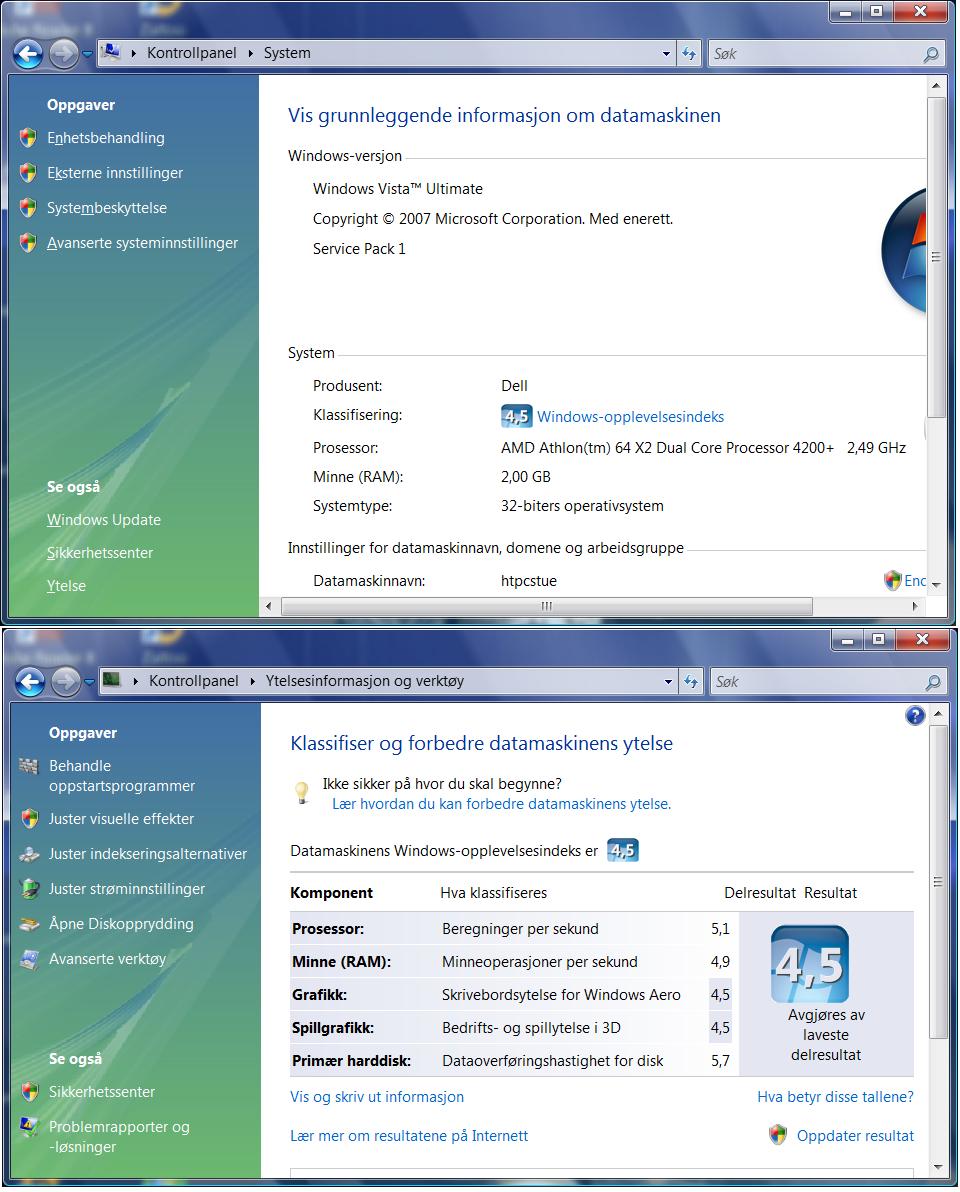 -alias- Skrevet 29. januar 2009 Skrevet 29. januar 2009 (endret) Kom på at jeg har en AMD X2 4200+ i stuemaskinen. Med Vista Ultimate x86 2GB RAM ender Windows-opplevelseindeks på 4.8 som nok er korrekt for denne prosessoren. Overklokket til 2.5HGz havner vi på 5.1. Endret 29. januar 2009 av -alias-