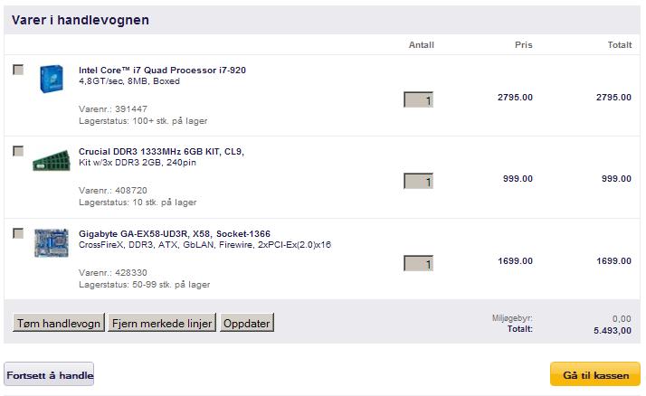 Theo343 Skrevet 10. februar 2009 Skrevet 10. februar 2009 (endret) Over 15k? Trenger ikke så mye: - x58 HK 1699,- - 6GB DDR3 999,- - Ci7 920 2795,- ----------------------------- sum = 5493,- Dette er ikke engang det billigste jeg fant, men lagervarer hos komplett.no klar for kjøp her og nå Skjønner ikke helt hvor du fikk de 14-15.000 fra? Følger ikke helt med kanskje? *spøk* EDIT: Lagt til bilde av handlekurv fra komplett.no nå. Endret 10. februar 2009 av Theo343