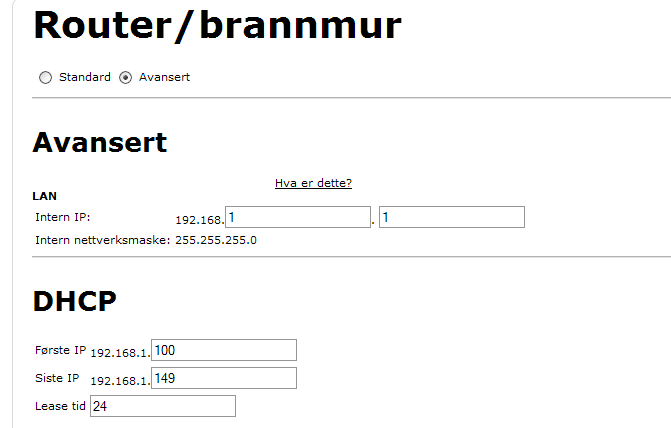 MooseOnTheRun Skrevet 28. mars 2009 Forfatter Skrevet 28. mars 2009 (endret) Har den vell i DHCP ja, siden det står første og andre ip under DHCP... Men vet ikke hvordan jeg tar det av i hjemmesentralen. Vet bare hvordan i routeren. Har du forstått problemet helt? er vanskkelig å forklare... Det som var problemet var at når jeg brukte routeren og modemet samtidig( kabel fra hjemmesentral til router) så fikk jeg ikke åpenet portene siden lokale ipen til hjemmesentralen var noe annet en lokale ipen til routeren. routeren ga ut iper som f.eks 192.168.1.100 til pcene, mens når jeg skulle åpne porter i hjemmesentralen så kunne jeg bare endre siste siffer (se bilde) og da åpent den portene til en ip adresse som ikke var på nettverket( siden routern sendte ut en annen ip adresse) Endret 28. mars 2009 av MooseOnTheRun