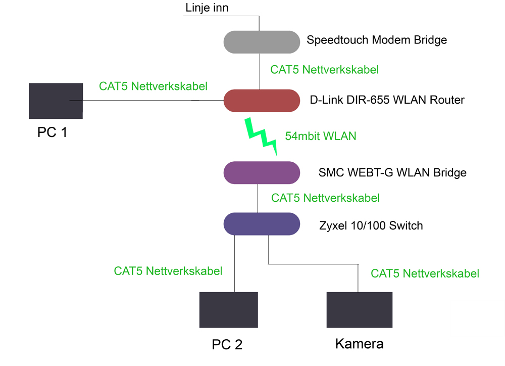 Sozinho Skrevet 21. mars 2009 Skrevet 21. mars 2009 (endret) Hei! Sliter med oppsett av nettverk for en bekjent av meg. Han har kjøpt seg ett Vivotek PZ6114 nettverkskamera (Link til kamera) som han vil ha tilgang til via internett. Oppsettet er som vist på den vedlagte tegningen. Internett i form av Telenor ADSL kommer inn via ett Speedtouch modem satt som bridge. Det går deretter en kabel til en D-Link DIR-655 router. Fra denne går det en kabel til en vanlig PC med Windows XP. Fra DIR-655 routeren går det trådløst via en antenne på veggen ut til nabohuset. Der blir signalet tatt i mot av nok en antenne hvor det går inn til en SMC WEBT-G nettverksbridge. Deretter er det koblet til en Zyxel 10/100 5-port switch på port nummer 5. I denne switchen er det koblet til nok en helt vanlig PC med Windows XP i port nummer 1. På port nummer 2 står det ett kamera med nettverksport type Vivotek PZ6114. Kameraet kjører en webserver av en eller annen type. For å få tilgang til denne, åpner man en nettleser og skriver inn ip-adressen til kameraet. HTTP/TCP på port 80 er standard. Det finnes en rekke innstillinger for kameraet, alt i fra nettverksoppsett til kvalitet på bilde eller video. Nettverket er satt opp slik: Router - 192.168.1.1 PC 1 - 192.168.1.10 SMC Bridge - 192.168.11 PC 2 - 192.168.1.12 Kamera - 192.168.1.13 Så til den vanskelige biten... Jeg får tilgang til kameraet på den pcen (PC2) som er koblet til samme switch som kameraet. Jeg får ikke tilgang til kameraet fra pcen som står sammen med modem og router (PC1) Jeg kan pinge PC1 fra PC2 og omvendt Jeg kan ikke pinge kameraet fra PC1 Både PC1 og PC2 har internett og alt fungerer tilsynelatende som normalt Jeg kan kjøre fjerntilkobling (Remote Desktop) fra PC1 til PC2 Jeg får tilgang til routeren fra begge pcene Ideen her var først og fremst å få tilgang til kameraet utenfra ved å forwarde de portene kameraet trenger i routeren. Men når jeg ikke engang får tak i kameraet via PC1 som er på samme lokalnettverk vet jeg ikke hva jeg skal se etter eller forsøke nå. Alle maskinene på nettverket kjører DHCP utenom kameraet som har fått fast ip. Nettverksmaske, dns-adresser osv er likt som på de andre. Har forsøkt forskjellige kombinasjoner uten hell. Ved å velge DHCP i kameraet, og så reboote dette for at innstillingene skal tre i kraft får det ikke noen ip-adresse, men faller tilbake til "default ip" som er fastsatt i programvaren. Det virker som om det tar for lang tid å spørre routeren om IP via switch, bridge, 150 meter luftlinje og så inn på routeren. Ble mye tekst dette her, men forsøkte så godt jeg kunne å kartlegge så mye som mulig slik at en eller annen snill sjel kan hjelpe meg litt. Blir å kontakte leverandør av kameraet til uken, dog er jeg ikke så sterk i engelsk når det gjelder å formulere problemer som dette. På forhånd takk Endret 21. mars 2009 av Sozinho