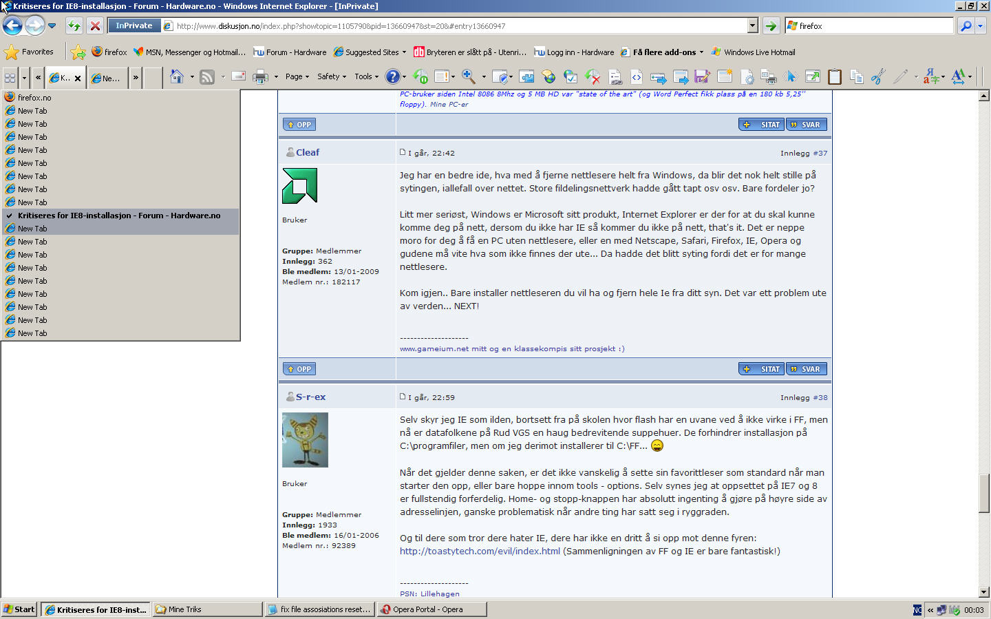 Selv skyr jeg IE som ilden, bortsett fra på skolen hvor flash har en uvane ved å ikke virke i FF, men nå er datafolkene på Rud VGS en haug bedrevitende suppehuer. De forhindrer installasjon på C:\programfiler, men om jeg derimot installerer til C:\FF... :lol: