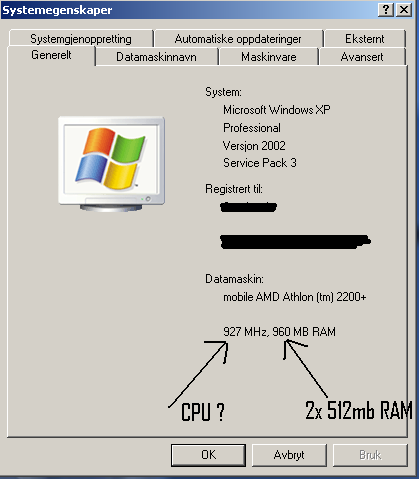 A-Dawg Skrevet 8. mai 2009 Skrevet 8. mai 2009 Hei. Holder på å fikse en gammel laptop, fujitsu siemens Amilo. Den har en AMD Athlon XP 2200+ prosessor og 1gb ram med win xp pro sp3. I følge CPU-Z er hastigheten på CPU 1800mhz, men på egenskaper under "min datamaskin" står det oppført 927mhz. Er pc`n begrenset til 927mhz, eller viser windows feil? Hva kan jeg gjøre for å forbedre det? Håper på svar winxp.bmp