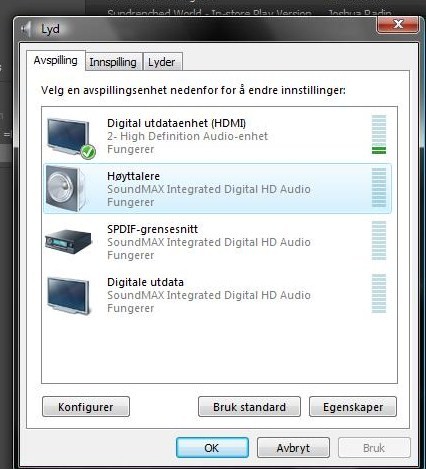 wiberos Skrevet 15. mai 2009 Skrevet 15. mai 2009 Jeg tror at du må i Controll panel og dobbelt klikk på Lyd. Det er der du skal gjøre noe endringer tror jeg.
