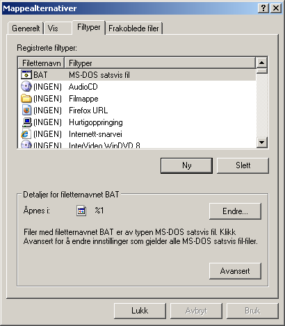 fenderebest Skrevet 11. juli 2009 Skrevet 11. juli 2009 (endret) Det du skal gjøre er dette mer bestemt: Lag en ny fil type .bat og trykk avansert og under listen assosierte filtyper velger du MS-DOS satsvis fil og deretter trykker du OK. Da skal det stå at filen Åpnes i: %1. Hvis det ikke står dette skal det gå an å stille det tilbake til standard. Slik skal det mao se ut: Endret 11. juli 2009 av fenderebest