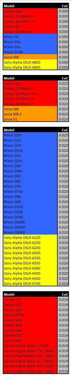 arthon Skrevet 15. mars 2010 Skrevet 15. mars 2010 (endret) Flere objektiv relaterte hjelpemidler; Når vi ønsker å ta bilder med stor dybdeskarphet så er det ofte å vanskelig å vite hvor midt punktet for det skarpe området skal legges. Dette gjelder spesielt ved landskap foto hvor man ønsker uendelig dybdeskarphet. Dette kalles Hyperfokal Distanse. Her er en link til tabeller over hyper fokale distanser for alle brennvidder og kameraer. Hyperfocal Distances Siden linker ofte blir borte eller brutt over tid så laster jeg opp pdf filene i "regular"størrelse. (finnes også større i linken) Hyperfocal Distance CoC 0.03 Regular.pdf Hyperfocal Distance CoC 0.023 Regular.pdf Hyperfocal Distance CoC 0.02 Regular.pdf Hyperfocal Distance CoC 0.019 Regular.pdf En printet versjon av disse tabellene burde være standard innholdet i enhver landskaps fotografs sekk. Oversikt over hvilken tabell hører til hvilket kamera; Kanskje en Canon Lens kaffe mugge burde være med på langtur også? (noen norsk butikk som har tenkt å importere slike? hint hint) Endret 15. mars 2010 av arthon