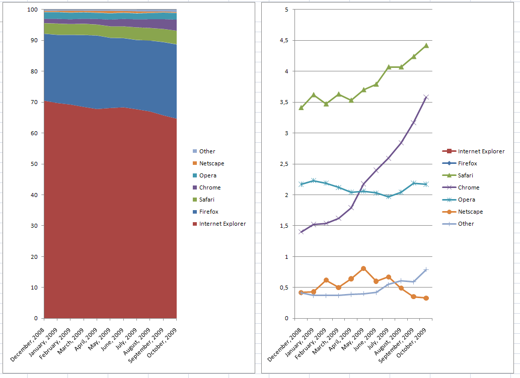 Simen1 Skrevet 4. november 2009 Skrevet 4. november 2009 Statistikken for siste år presentert på to ulike måter. 1. Stablet arealdiagram 2. Linjediagram (IE og Firefox er fjernet for å kunne se endringene blant de små bedre) NB. Net applications har vært kraftig kritisert for manipulasjon av tallene. Ta derfor tallmaterialet med en klype salt.