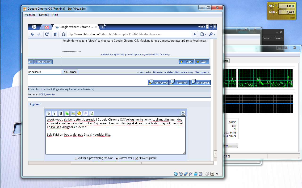 8086 Skrevet 20. november 2009 Skrevet 20. november 2009 Nå er Chrome OS testet og de få tingene jeg kan si er: * Vilt ustabilt. Prøvde 2 ganger å skrive dette innlegget i Chromium, men det hang seg begge gangene. OK at alt kjører i nettleseren, men om den henger ... Ajaj. * Norsk tastatur funker ikke. Ikke helt intuitivt hvordan man fikser dette, men det er et mikroskopisk problem. * Booter KJAPT. Tok 5 sek å nå loginskjermen i en virtuell maskin. * Ikke så veldig imponert, men ser absolutt nytten av å ha en maskin som er operasjonsklar på 5-6 sek! Om noen har lyst til å prøve kan de følge denne lenken.