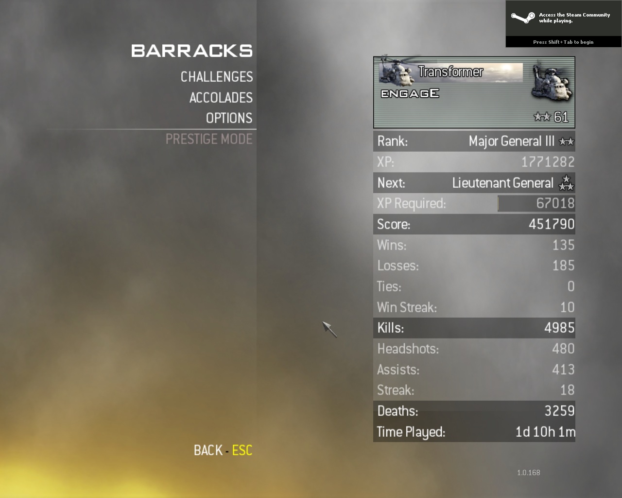 PgUp Skrevet 24. november 2009 Skrevet 24. november 2009 Hei! Tenkte vi kunne poste litt stats her. Kan og diskutere metoder for å oppnå dette. Ha gjerne med bilde om dere spiller på pc. K/D ratio: 2,19 Killstreak: 28 Winstreak: 89 Win ratio: 1.79
