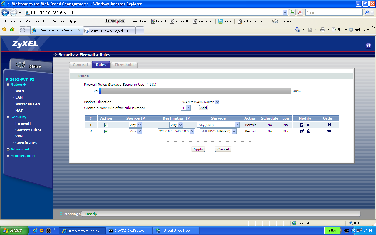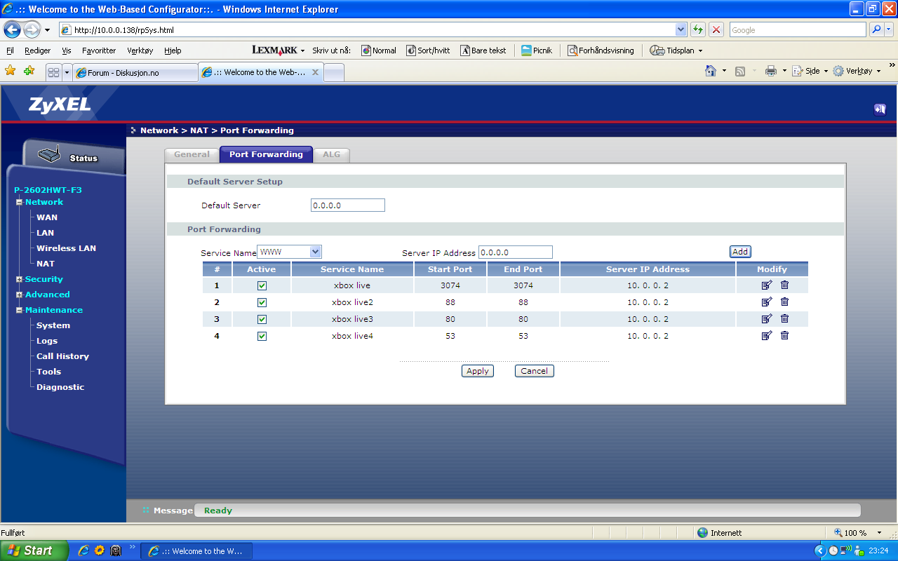 skybertharmp5 Skrevet 29. november 2009 Skrevet 29. november 2009 hei. har problemmer med og hoste med zyxel P2602-F3. skal hoste med xbox 360 på modern warfare 2 men får det ikke til. det står at eg har åpen NAT men får aldri hosten men visst eg kjører denne zyxel i bridge og bruker ruter utenom da funker det og eg får hosten nesten hele tiden. men får ikke lov til det . tror problemmet er at zyxel blokker inkommende ip til ruteren men har ikke peiling på kordan eg fikser dette tullet. du kan se i bilde filene ka eg har åpnet av porter så langt. alt virker visst eg slår av brannmuren men får ikke lov til og slå den av ut av han som eier nettet, noen som har en ide om kordan eg får det til og funke ? MVH SKYBERT zyxel.bmp zyxel_2.bmp