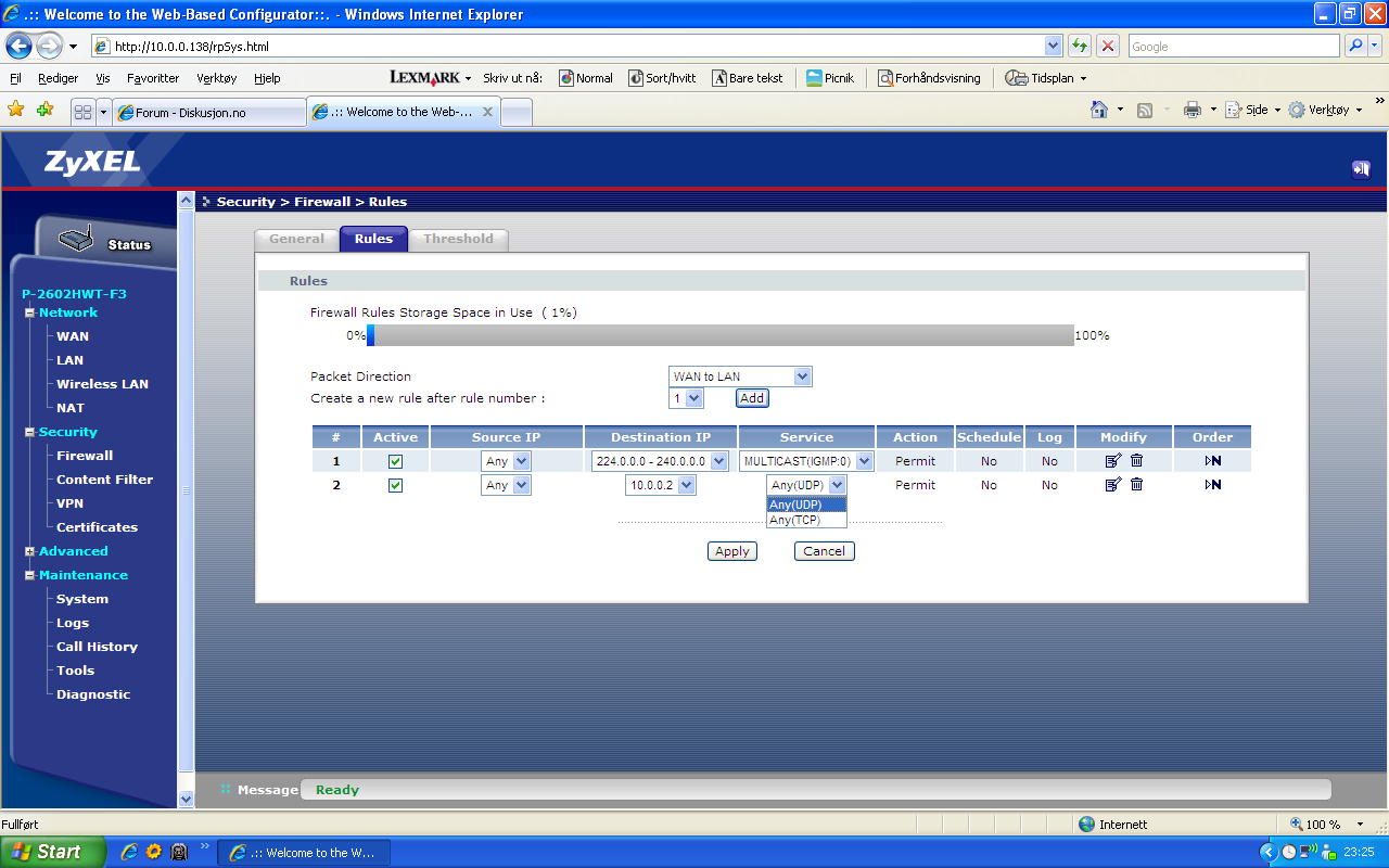 skybertharmp5 Skrevet 30. november 2009 Forfatter Skrevet 30. november 2009 (endret) Under "Firewall" og "Rules" så setter du "Destination IP" til Any.. Slik at det er portforwardingene som ordner resten. Dersom dette ikke fungerer, er alternativet å legge inn en regel for hver port under "Firewall" -> "Rules" Merk at du bør ha "Destination IP" på Any. Hvilken IP det går til ligger under "Nat" -> "Port forwarding" Lykke til. det har ingenting og si om du tar any eller local ip funker like greit det fungere helt fint WAN til LAN men det er WAN til WAN som er stress ! se bilde fil. noen som har en ide om kordan eg kan fikse det? zyxel3.bmp Endret 30. november 2009 av skybertharmp5