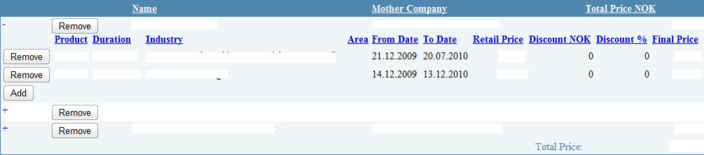 :Francis: Skrevet 1. desember 2009 Skrevet 1. desember 2009 (endret) Jeg har et nested GridView som i og for seg fungerer helt som det skal. Det eneste jeg savner er å kunne sortere de indre elementene. Det går fint an å sortere det ytre GridViewet, men selv om AllowSorting er satt til True på det indre Gridviewet responderer ikke knappene. Jeg tror det som har skjedd er at det indre GridViewet på en eller annen måte ligger under det ytre, men jeg vet ikke hvordan jeg får det frem til toppen. Er det noen som har ideer til hvordan jeg kan få knappene til å respondere? <asp:GridView ID="GridView1" runat="server" DataSourceID="ObjectDataSource1" AllowSorting="True" OnRowCommand="GridView1_RowCommand" ShowFooter="True" GridLines="None" CssClass="mGrid" Width="1004" Font-Names="Ariel" Font-Size="11" HeaderStyle-HorizontalAlign="Left" HeaderStyle-ForeColor="White" FooterStyle-HorizontalAlign="Right" AlternatingRowStyle-BackColor="White" RowStyle-VerticalAlign="Top" BackColor="#F0F5F8"> <Columns> <asp:TemplateField> <ItemTemplate> <asp:LinkButton ID="LinkButton1" runat="server" Font-Underline="false" Width="40" onclick="LinkButton1_Click">+ </asp:LinkButton> <asp:Panel ID="Panel1" runat="server" Visible="False" Width="10px"> <asp:GridView ID="GridView2" runat="server" ShowFooter="True" HeaderStyle-HorizontalAlign="Left" CssClass="grid2" GridLines="None" Width="1000px" AllowSorting="True"> <Columns> <asp:TemplateField ShowHeader="False"> <ItemTemplate> <asp:Button ID="Remove" runat="server" Text="Remove" OnClick="removeButton_Click" /> </ItemTemplate> <FooterTemplate> <asp:Button ID="AddButton" runat="server" OnClick="addButton_Click" CausesValidation="true" Text="Add" /> </FooterTemplate> </asp:TemplateField> </Columns> <HeaderStyle HorizontalAlign="Left" /> </asp:GridView> </asp:Panel> </ItemTemplate> </asp:TemplateField> <asp:ButtonField ButtonType="Button" Text="Remove" CommandName="remove" /> </Columns> </asp:GridView> Setter stor pris på all hjelp! Mvh Francis Endret 1. desember 2009 av :Francis: