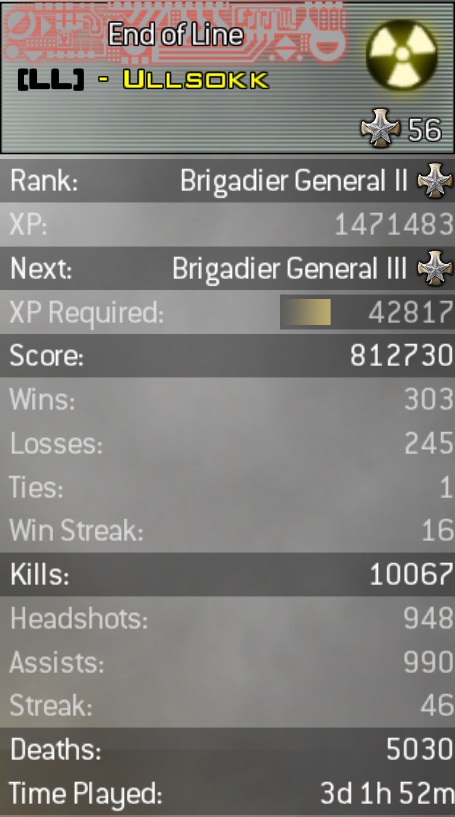 PgUp Skrevet 16. desember 2009 Skrevet 16. desember 2009 (endret) k/d på 2,24. Var oppe i 2,39, men sank da jeg konsentrerte meg om andre game-modes enn FFA. 3d 10t spillt. Har 14k kills og 6k deaths. Killstreak 30. 1. prestige lvl 59. Endret 16. desember 2009 av Cuz