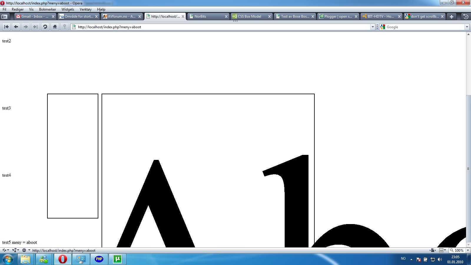 hean Skrevet 1. januar 2010 Forfatter Skrevet 1. januar 2010 hm... problematisk... post koden, så ser jeg/vi kanskje hva som er årsaken Har uthevet det mest relevante... A:link, A:visited, A:active, A:hover{ text-decoration:none; color:#000000; } p.meny { height:400px; width:150px; padding:10px; border:2px solid black; margin:10px; position:fixed; top:200px; left:150px; color:red; text-align:left; font-size:20px; } p.innhold { height:600px; width:700px; padding:10px; border:2px solid black; margin:10px; position:fixed; top:200px; left:335px; color:red; text-align:left; font-size:20px; } echo "<html>";echo "<head>"; echo "<link rel=\"stylesheet\" type=\"text/css\" href=\"minstil.css\" />"; echo "</head>"; echo "<body style=\"overflow:scroll\">"; $meny = "null"; if (isset($_GET['meny'])) { } else { $_GET['meny'] = $meny; } echo "<p class=\"meny\">"; echo "<a href=\"index.php?meny=aboot\">About</a>"; echo "</p>"; echo "<p class=\"innhold\">"; echo "</p>"; if ($_GET["meny"]=="aboot") { echo " " . "meny = aboot" . " "; } echo "</body>"; echo "</html>"; Er kun i startfasen for å komme opp på det nivået jeg hadde en gang men når det dukker slik "unødvendige" problemer opp blir jeg oppgitt. Bruker Opera, prøvde også å åpne i Explorer men virket ikke der heller.